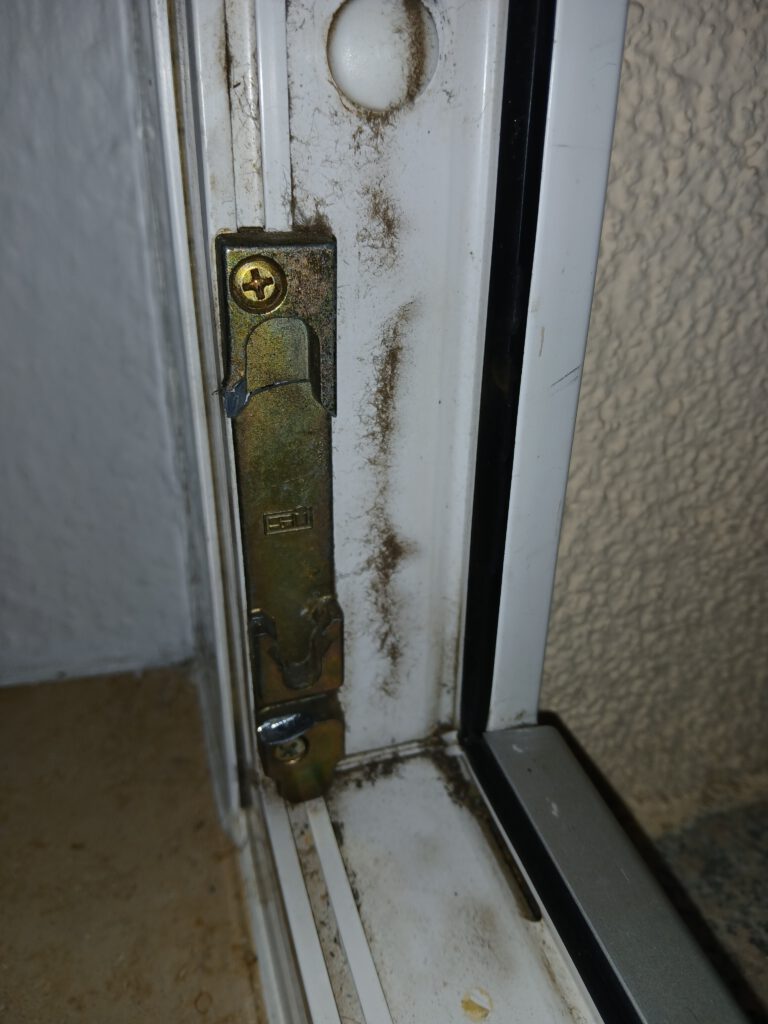 Rundherum sieht man außerdem Schmutzablagerungen, dunkle Flecken und Feuchtigkeitsspuren, was darauf hindeutet, dass das Bauteil längere Zeit nicht gewartet oder gereinigt wurde. Die Mechanik wirkt abgenutzt, insbesondere der Bereich, an dem der Schließzapfen einrastet.