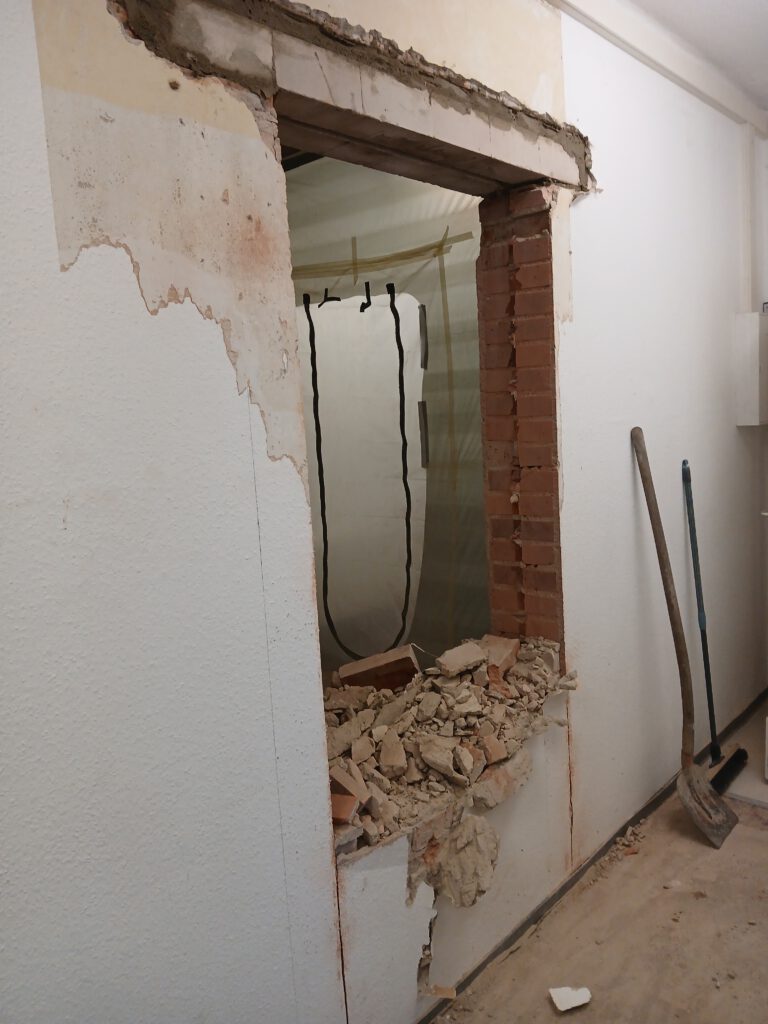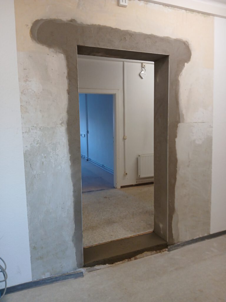 in Mauerwerk inkl. statischer Sicherung durch Einbau eines Sturzes. Herstellung der Öffnung mit vorheriger Abstützung, Einsetzen des Sturzes mit ausreichenden Auflagern und anschließendem Rückbau des Mauerwerks. Saubere Ausarbeitung der Laibungen sowie Verputzarbeiten für eine optisch und technisch einwandfreie Oberfläche
